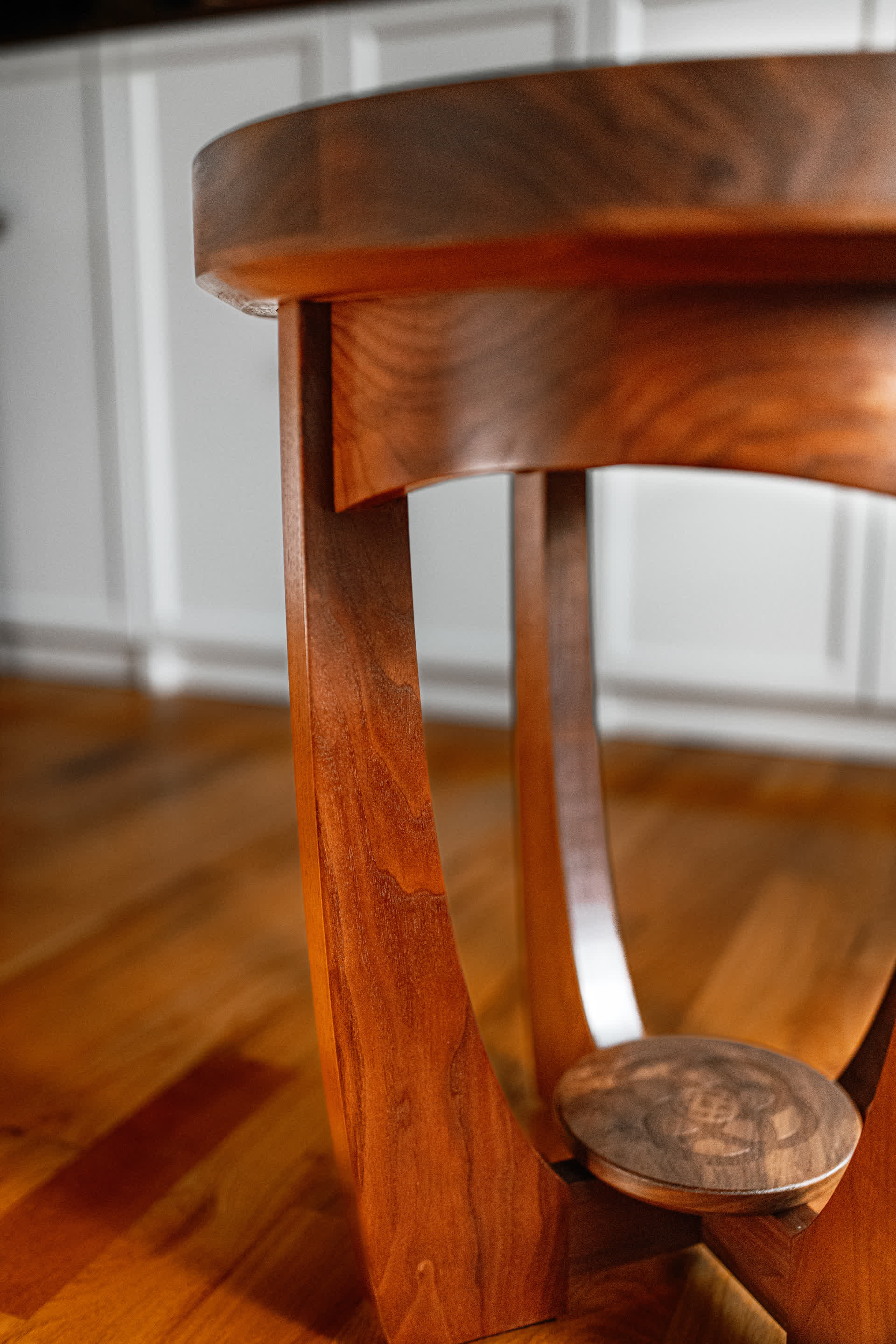 An heirloom-quality walnut and maple table inspired by EPCOT's geosphere, featuring integrated smart LED lighting. Use the contact form for direct inquiries.
